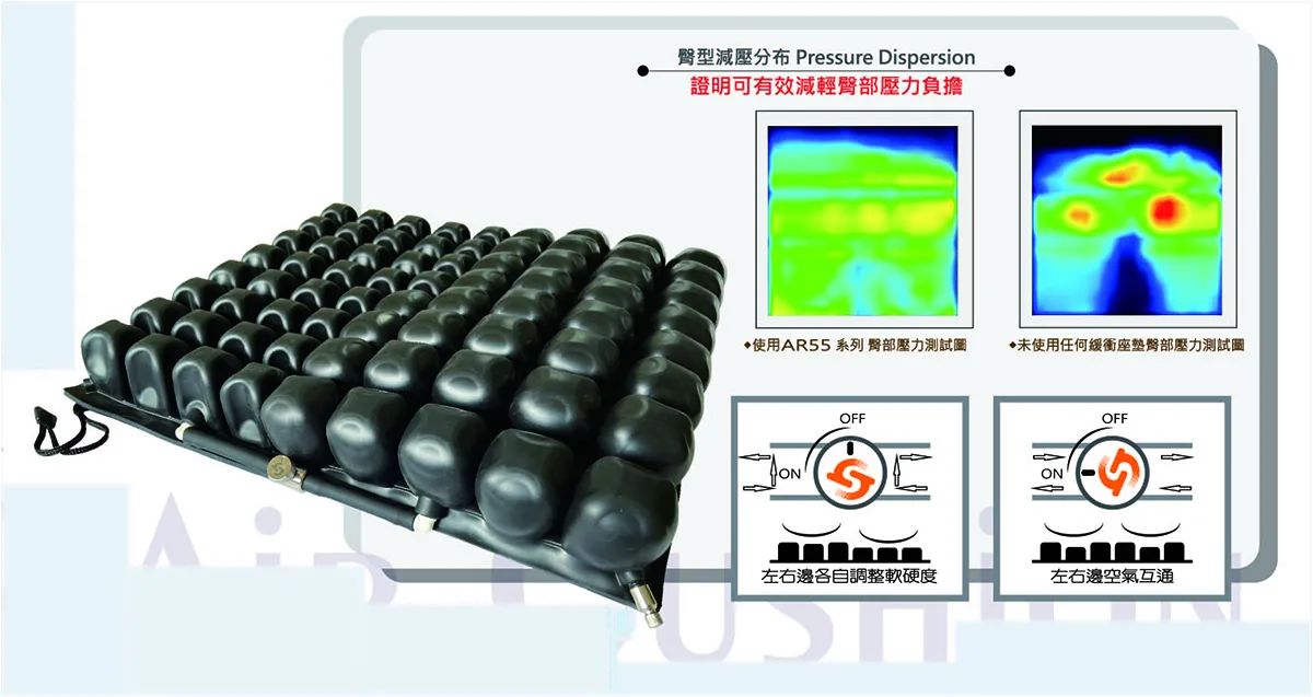• 氣囊數量為64或72個,顆數多而密集,讓接觸面積增加,使壓力分散及減壓能力大為提升,舒適穩定程度明顯卓越。