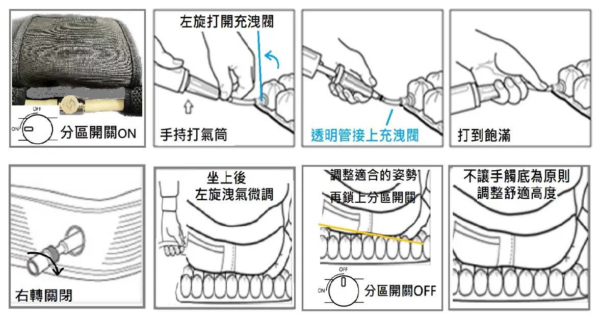 Step 3 | 手持打氣筒打氣於座墊直到飽滿,再將充洩閥右轉(順時針方向)關閉。 |